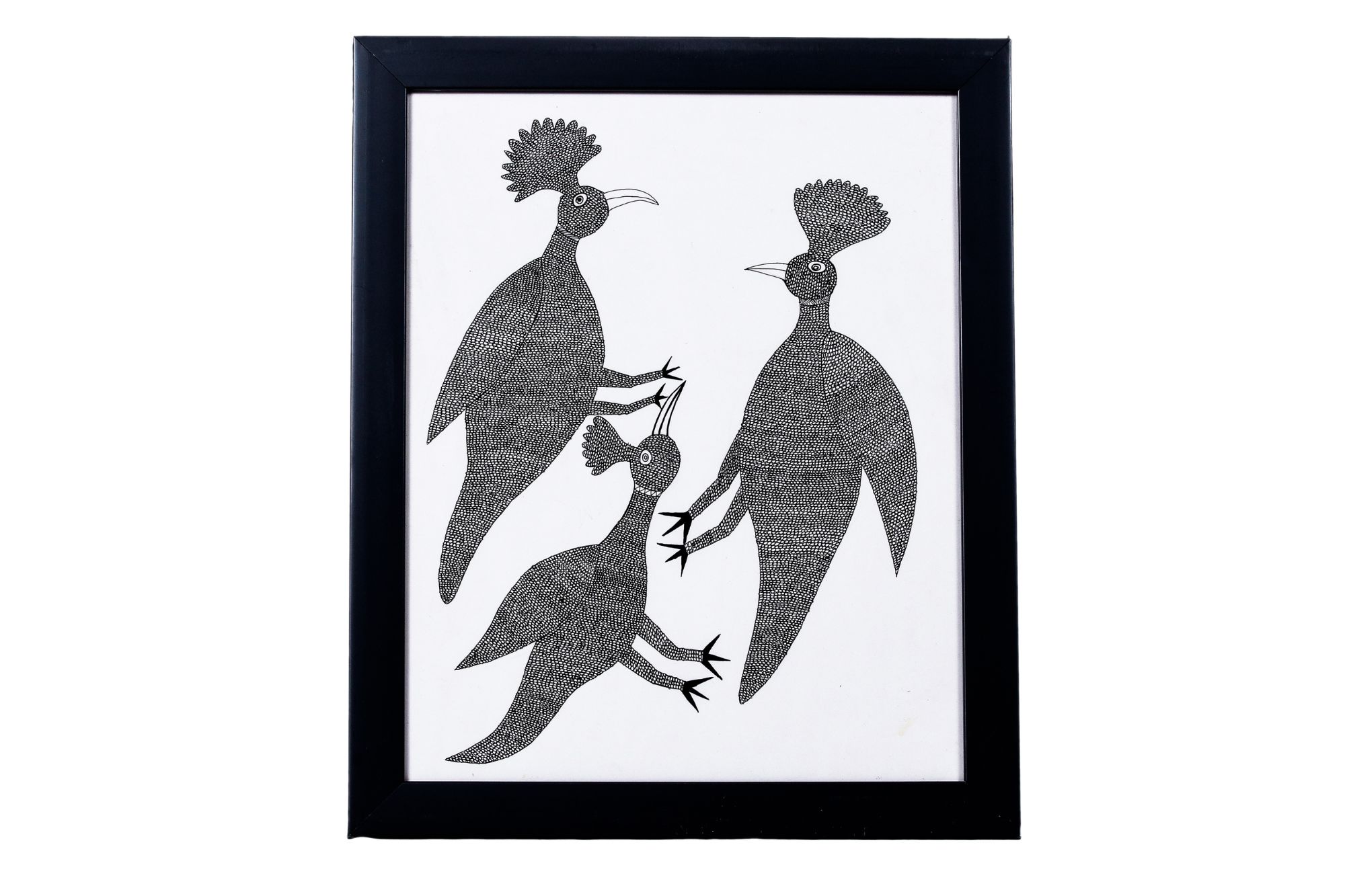 Ink on Paper: Crafted with ink on paper, this Gond painting is rendered in striking black and white tones, highlighting the intricate detail and fluidity of line characteristic of Gond art.